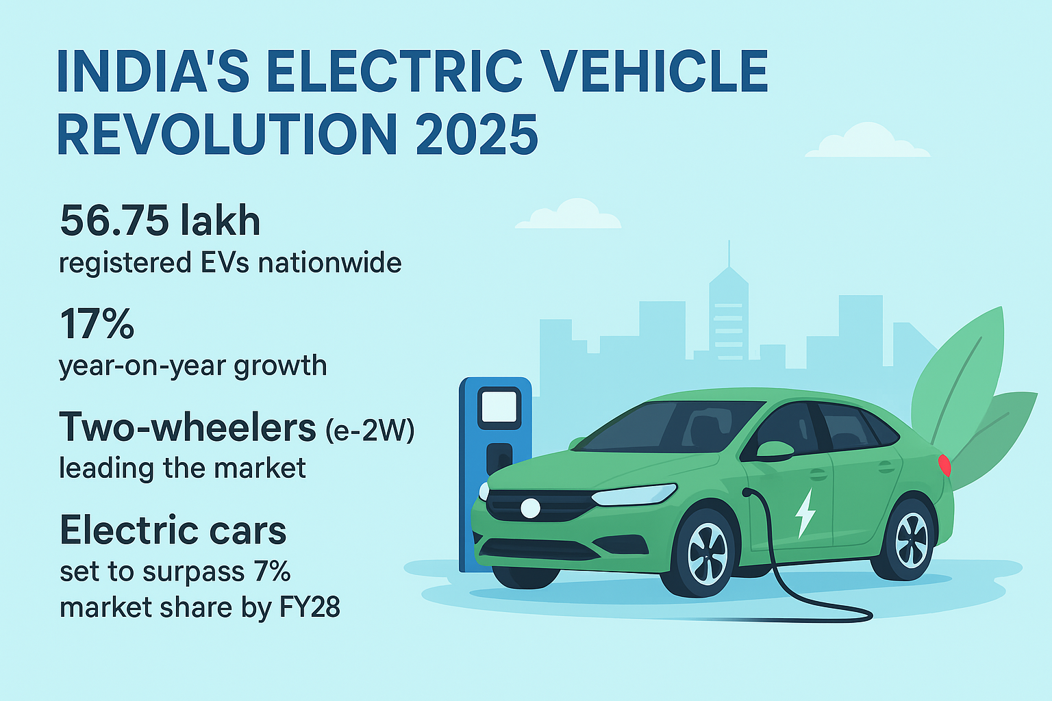 By early 2025, India achieved a remarkable milestone with over 56.75 lakh registered EVs nationwide. This surge represents a 17% year-on-year growth, highlighting how quickly adoption is picking up across all vehicle segments. Two-wheelers dominate the scene, with over 1.14 million electric scooters and bikes sold in FY25 alone, while electric cars and three-wheelers are steadily gaining ground.
