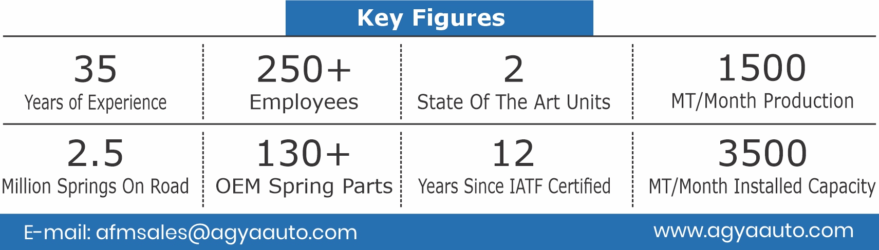 Agya has tried to stay ahead of the industry curve and launched Parabolic Springs in 2018. In 2020 they commissioned their new state of the Art facility of manufacturing Parabolic and Multi Leaf Springs with a monthly capacity of 2500 MT/ month taking our combined manufacturing capacity to 3500 MT/month. Agya Auto aims to grow in the Indian OEM and Aftermarket as well as the International Export market for multi Leaf Springs. They are committed to leap into the broader suspensions field in the coming years foraying into other technologies like Air suspensions and allied parts.